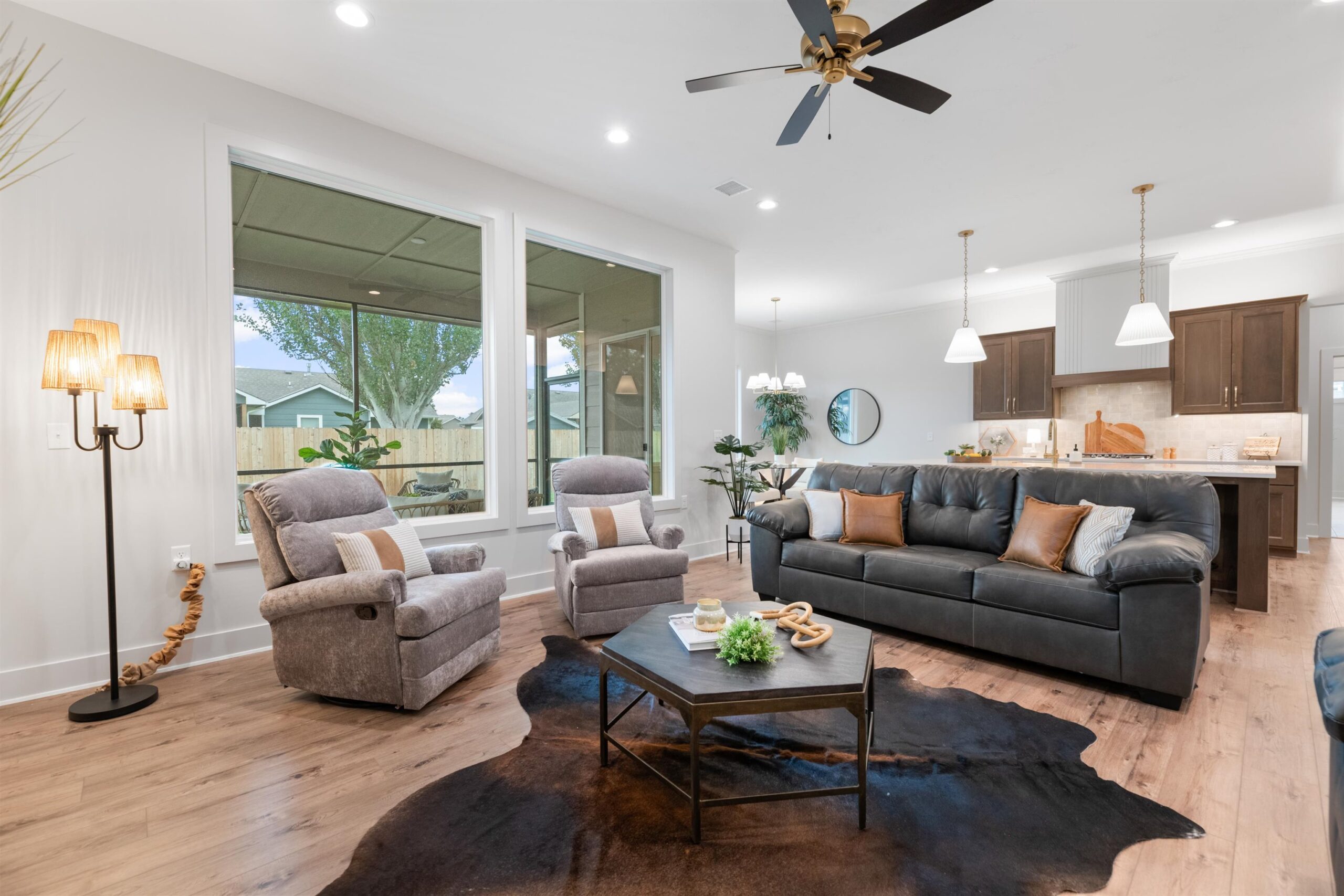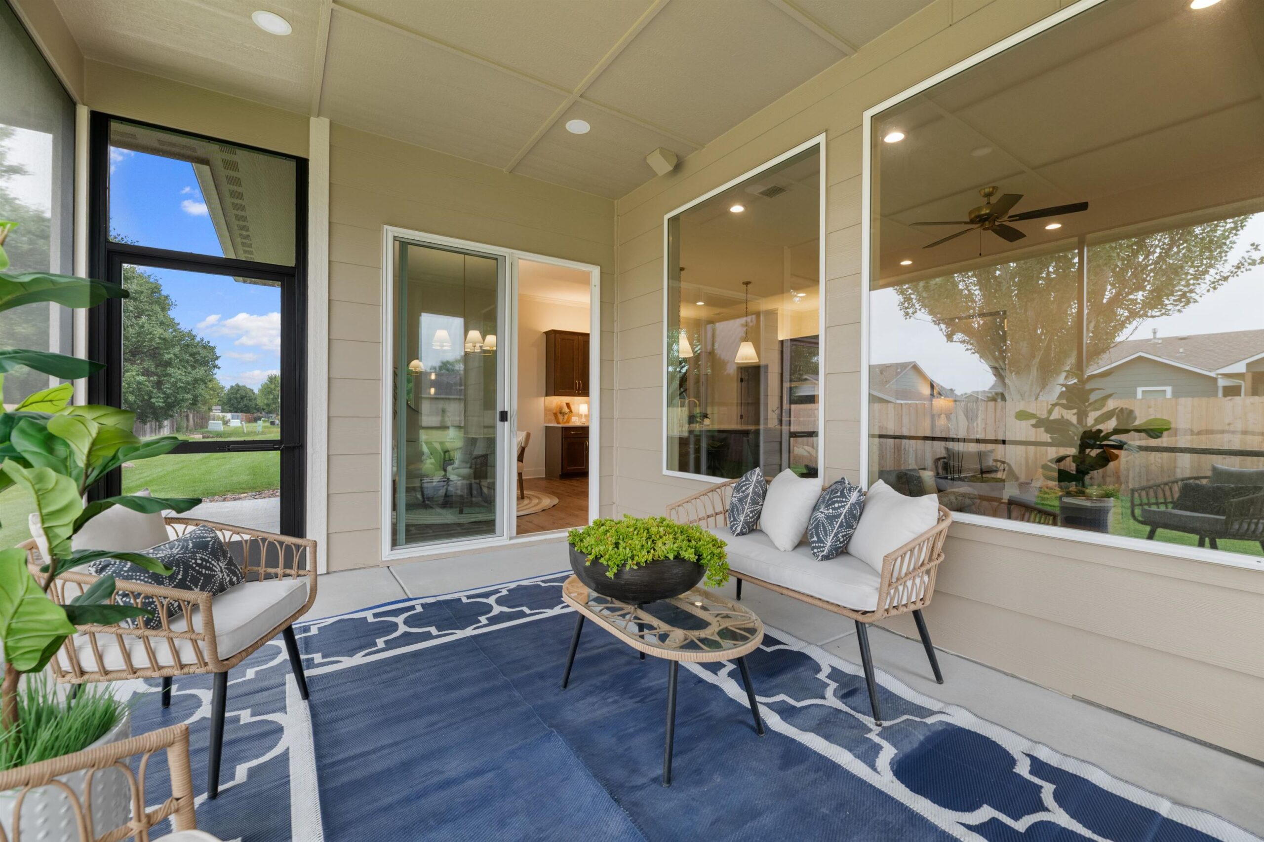 Welcome to your beautiful dream home! Nested on a peaceful cul-de-sac, this stunning 3 bedroom, 2-bathroom, 3 car garage patio home combines modern elegance with thoughtful design. From the moment you step in to the spacious entryway, you're greeted with warmth and luxury vinyl flooring which flows seamlessly throughout. The open-concept layout showcases a chef's kitchen adorned with quartz countertops, and an oversized eat-at island perfect for entertaining or cozy family dinners. Don't forget the walk-in pantry with tons of storage and outlets which also doubles as your safe room. Retreat to the serene master suite, featuring a spa-like walk-in shower and abundant closet and bathroom storage space. The expansive 3-car garage offers practicality and storage galore. Step outside to your covered and screened east backyard, ideal for family and friend gatherings and peaceful relaxation. This home truly has it all, offering both comfort and luxury in every detail. Window treatments are included! Take this opportunity to make this exquisite home your very own!